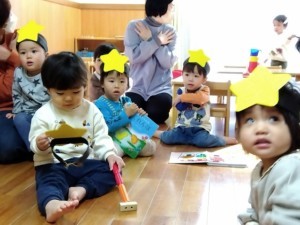 祝会当日は、保護者の方と一緒に出し物を見たり、讃美歌「おほしがひかる」「とてもさむい」に合わせて手遊びや身振りをしたりと、それぞれの形で参加する姿が見られました。星の冠を被って嬉しそうに過ごす子、プレゼントやクッキーを大事そうに抱える子、少し緊張しながらも笑顔で歌う子どもたちの姿に、成長を感じるひとときとなりました。