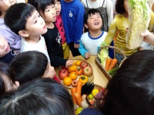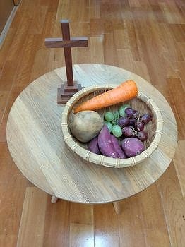 子どもたちは自分たちが家庭から持ってきた野菜や果物、友だちが用意してくれた実りを見せ合いながら「これ私が持って来たの」と言葉を交わし、恵みをくださる神さまへの感謝の祈りをささげました。