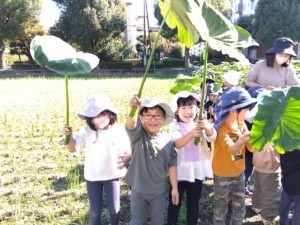 こすもす組では礼拝に向けて畑に出向き、大根・さつまいも・ラディッシュ・しょうが・里芋など多くの野菜を自分たちの手で収穫しました。大きな葉の里芋を見て「傘みたい!」と喜ぶ姿も見られ、収穫の喜びを身近に感じる時間となりました。