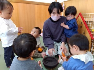 乳児クラスではそれぞれの保育室で小さな収穫感謝礼拝をしました。ご家庭から持ち寄っていただいた柿やミカン、ニンジン、さつまいもなど季節の実りを前にした子どもたちは興味津々。手に取ってじっと見つめたり触れた時の「ごつごつしているね」といった感触を楽しんだり、匂いをかいで「すっぱいかな?」と保育者と一緒に感じる姿が見られました。